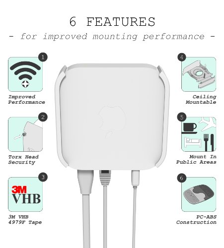 The 2 rear screw mounting holes allow your Apple AirPort Express flexible mounting to any flat surface, while the included 3M VHB tape pads allow an alternative 'quick mount' solution to areas where screws aren't convenient.