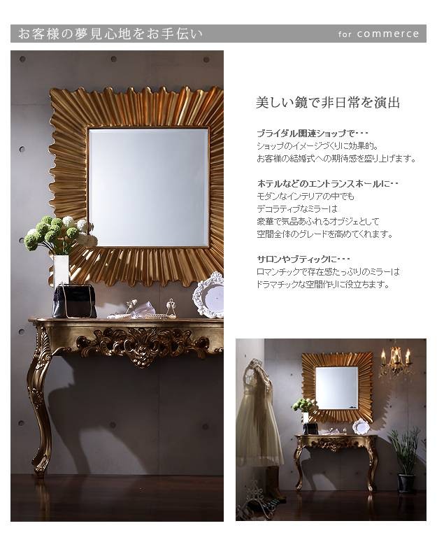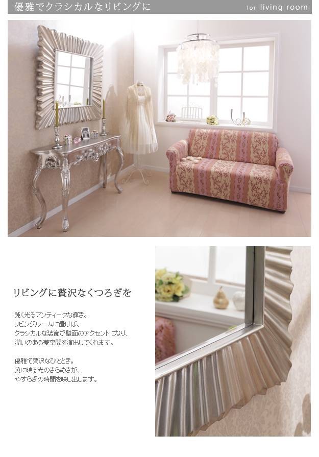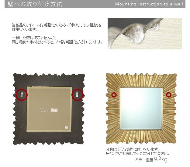 商品について:アンティーク仕上げの施された大きなフレームのデザインミラー。クラシック調のモチーフが施されたミラーはお部屋の雰囲気をガラリと変えることができます♪自宅だけではなく店舗のエントランスなどの空間演出に最適です☆石膏ボード壁用取付フックをプレゼント!※本体とは別送になります。