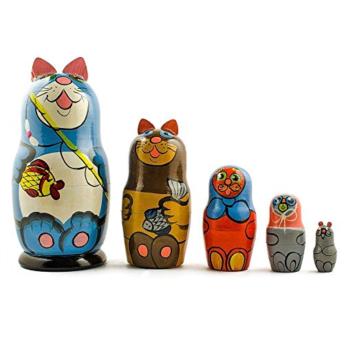 -. Title : 7" Set of 5 Blue Fishing Cats Boys Wooden Nesting Dolls