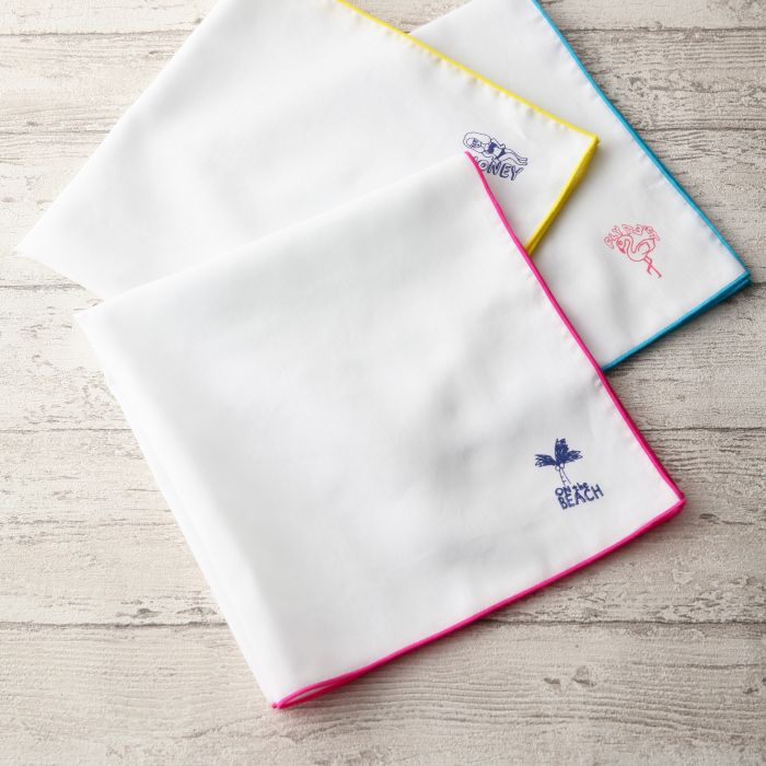 심플한 베이스 컬러로,네온 컬러의 멜로우와 캐치인 원 포인트 디자인이 매우 귀여운 손수건.