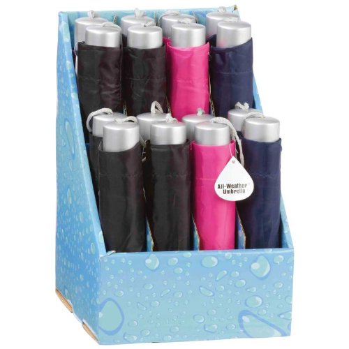 Studio : Maxam Publisher : Maxam Binding : Lawn Patio Product Description Rain or shine whether you require shielding or shading All-Weather™ umbrellas deploy quickly to give you the dependable coverage you need. Features assorted colors; telescopic fold and manual-open design; 3 section metal handle; and storage pouch. Convenient size for glove box or purse. Display measures 9" x 13-1/2" x 9". Not sold individually. Item Summary: Display Packs Umbrellas Countertop Display 0