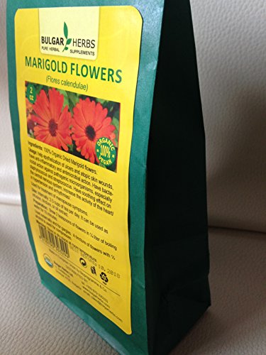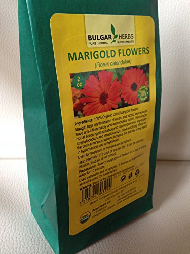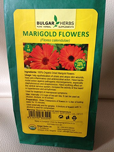 -. Feature : Ingredient: marigold flowers - 100% USAGE: help epythelization of ulcers and atopic skin wounds, have anti-inflammatory and antimicrobial action. Have bactericidal action against pathogenic microorganisms, especially staphylococcus and streptococcus. Have soothing effect on the central nervous system, increase the activity of the heart/in hypertension and arrhythmias/. / Used for treatment of menopause symp. / USE: Internally: 2-3 cups of tea per day. It can be used as infusion, tincture, or oil extract. PREPARATION: Brew 2 teaspoons of flowers in ¼ liter of boiling water for 10 minutes. / Used externally and for gargles. A tincture of flowers with ½ alcohol is used for compresses.