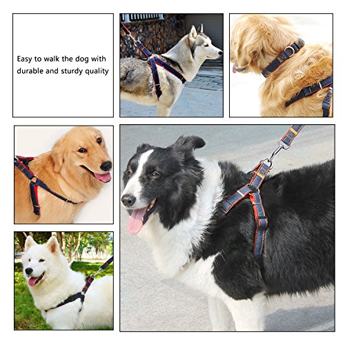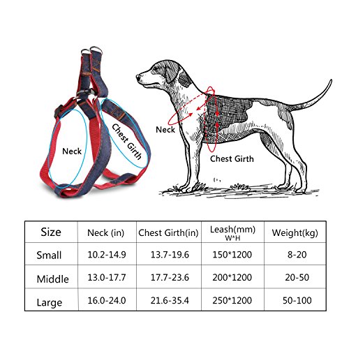 Feature:? The harnesses available here are safe and much more secure than the standard harness as it has comfortable body hugging material for the area that needs the most stability.? Easy to adjust to suitable size,quick snap on and off,makes maintaining control of our dog easy without any choking or binding.? Includes leash,the leash is approx. 1.2 meters (4ft)? Allows the a family pet member to have relaxed movement of muscles, makes it flexible and efficient.? Made of two layers of strong denim cloth, wear-resistant and durable; Connect you and your pet, make you the master whether you are in walking, running, jogging or hiking;