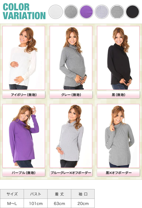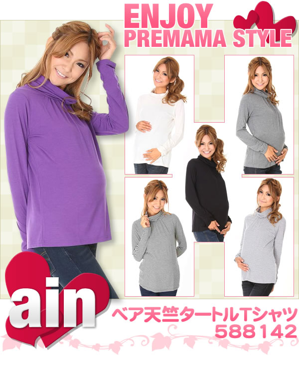 | プレママのためのオシャレなカジュアルブランド「ain」から、毎日使えるシンプルなタートルTシャツが登場。着心地抜群でヘビロテ決定☆袖口や首元にクシュッと入ったギャザーがPOINT! |