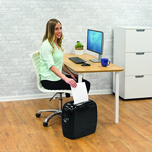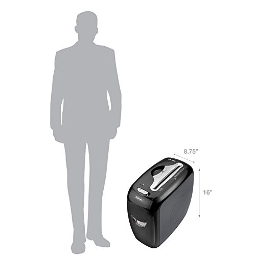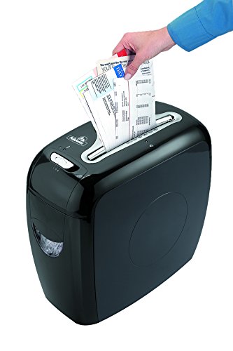 -. Feature : SafeSense technology stops shredding when hands touch the paper opening. / Shreds 12 sheets per pass into 5/32" x 2" cross-cut particles (security level P-3). / Safely shreds staples, paper clips, plastic credit cards and junk mail. / Shreds for up to 5 minutes before a 30 minute cool down period is needed. / 4-Gallon pull-out bin.