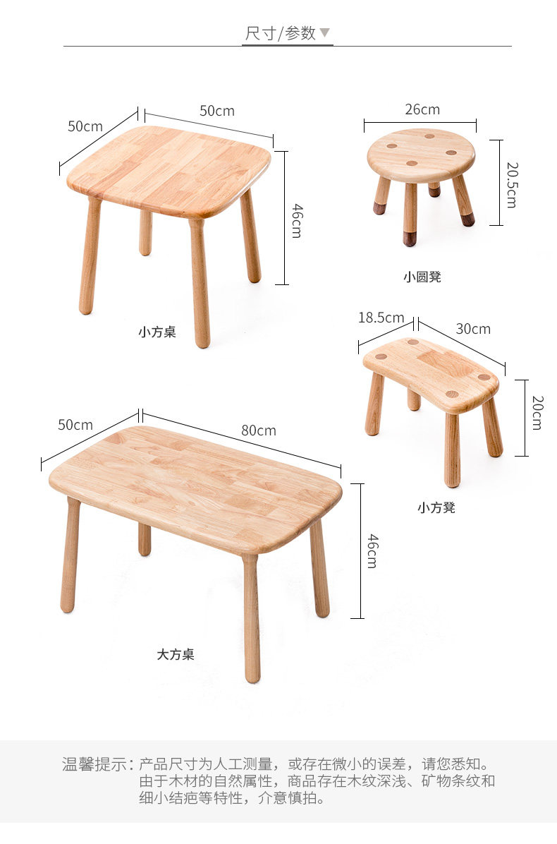 Product specifications Small square stool: 30 * 18.5 * 20cm Small stool: diameter 26 * height 20.5cm Generous table: 80 * 50 * 46cm Small square table: 50 * 50 * 46cm (Length x width x height)