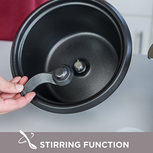The removable cooking pot, pasta/steaming basket, stirring arm, and glass lid, are all dishwasher-safe for easy cleanup.