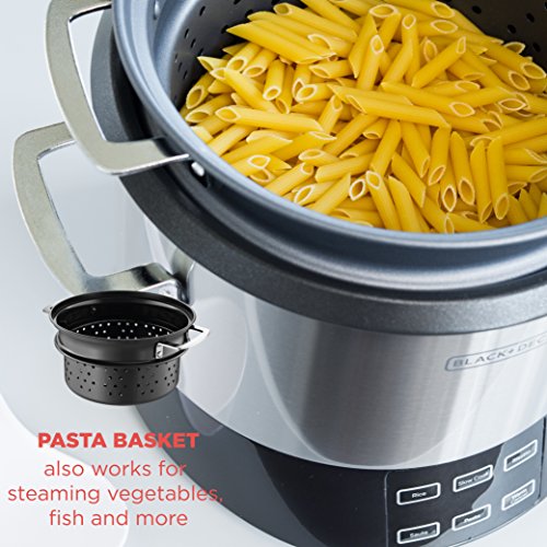 “Multi-Function” is the name of the game for the BLACK+DECKER All-In-One Cooking Pot and Rice Cooker. Preset functions give you options to cook rice, risotto, and pasta, and to slow cook, sauté, and keep food warm. A specially designed stirring function lets you create creamy, authentic risotto and does all the work for you. The nonstick pasta basket lets you use the cooking pot as a pasta cooker or a food steamer. Update your kitchen with the versatility and convenience of BLACK+DECKER.