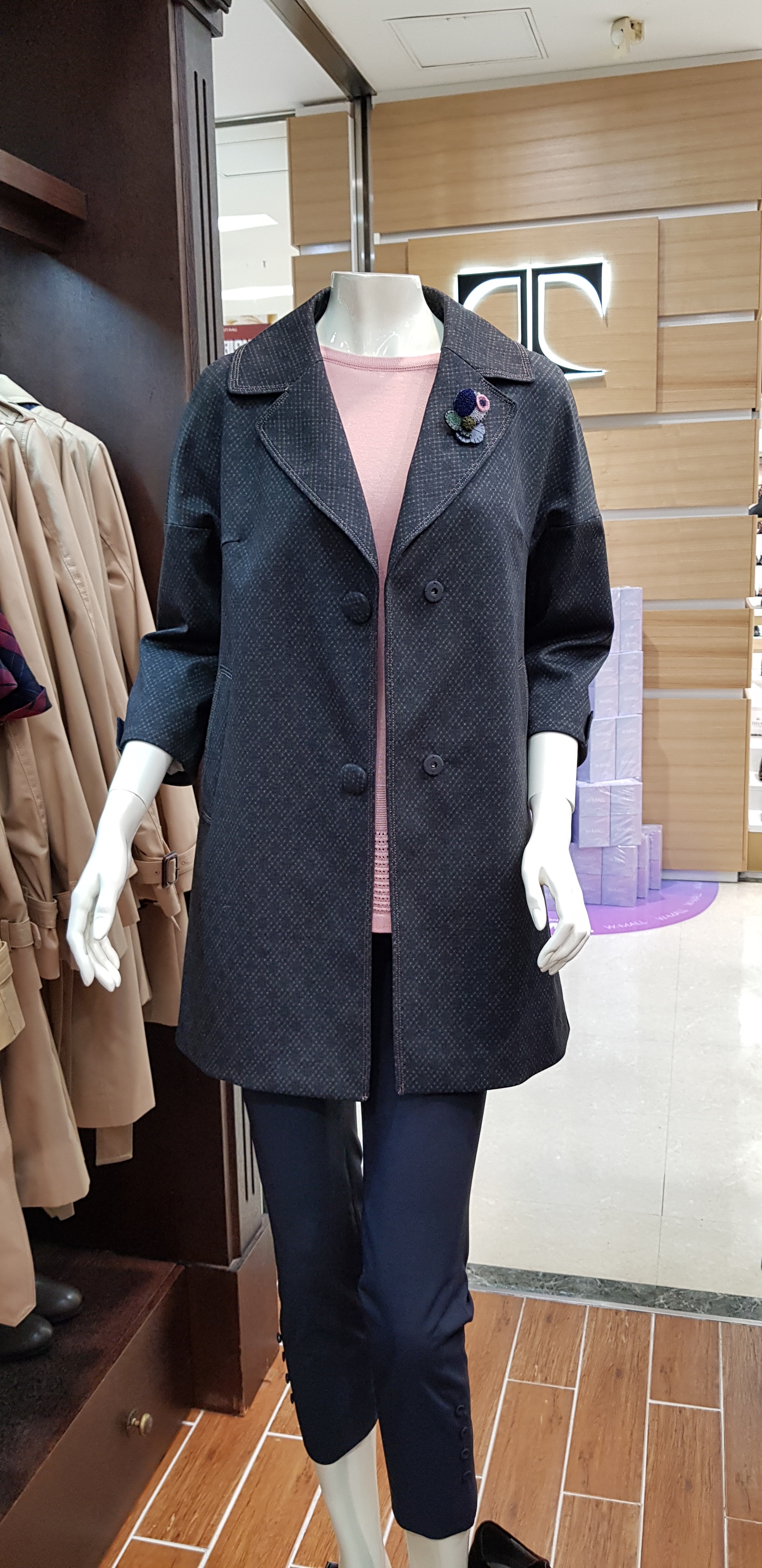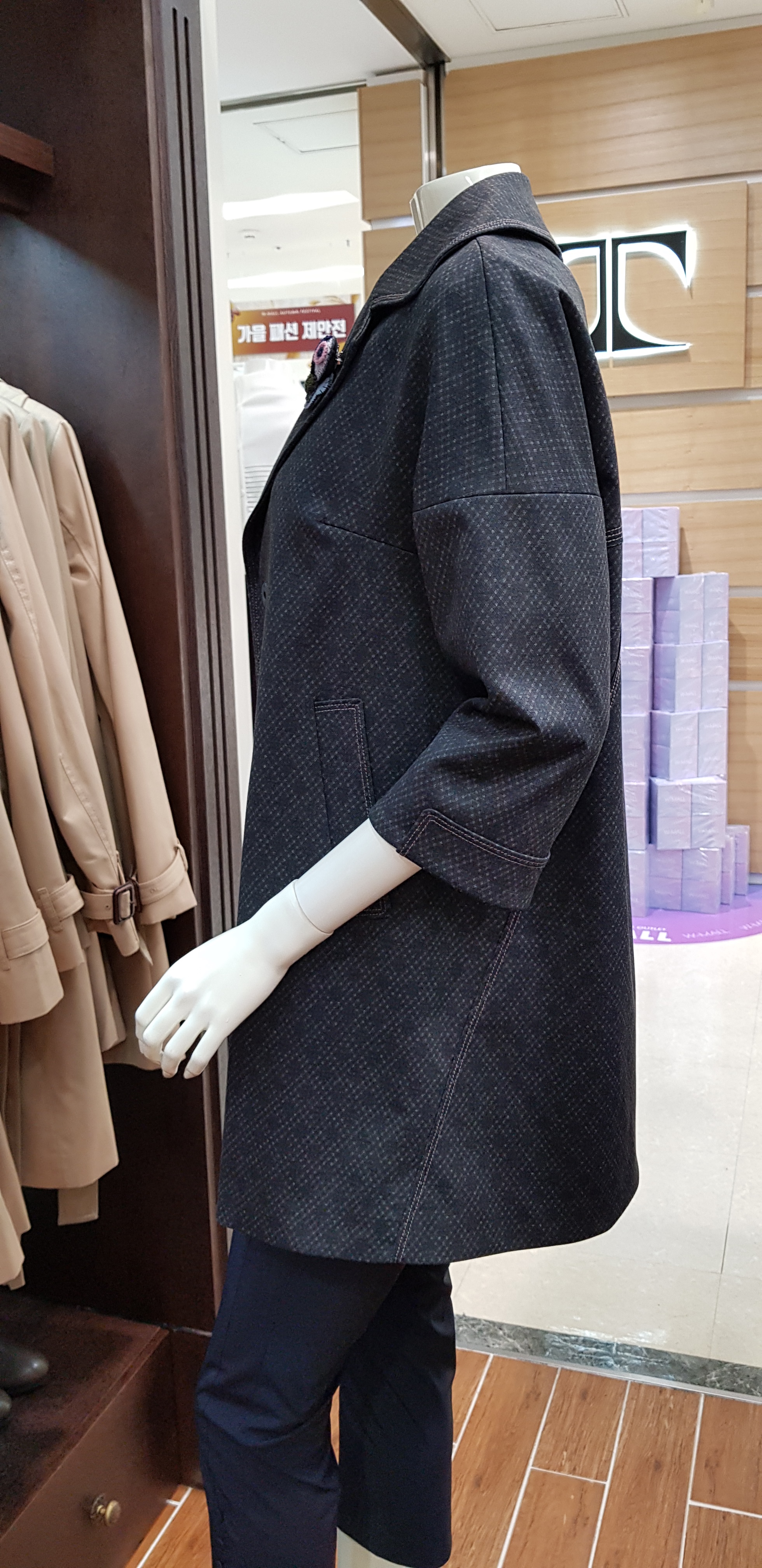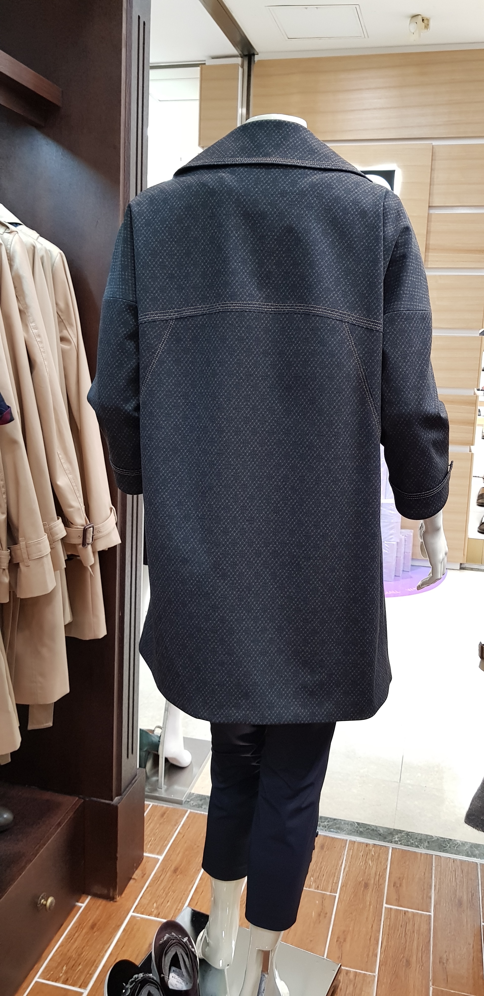기비~넓은 테일러카라의 포인트로 멋스러운 코트입니다 드롭어깨의 편안함이 있고 아가일문양으로 고급스런 분위기가 좋으며 원피스나 팬츠 어디에도 코디하기좋은 오버핏의 코트입니다 총장80센티입니다