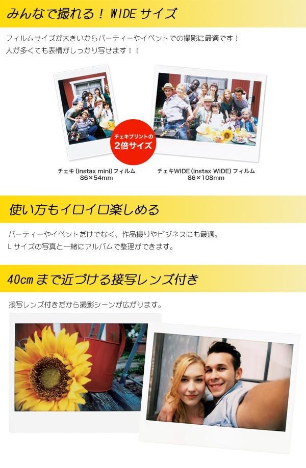 | 撮ったその場ですぐにカードサイズのプリントが楽しめるから、結婚式やパーティーなどのイベントはもちろん、日常シーンの撮影にもチェキが大活躍!フィルムサイズが大きいからパーティーやイベントでの撮影に最適です♪ |
