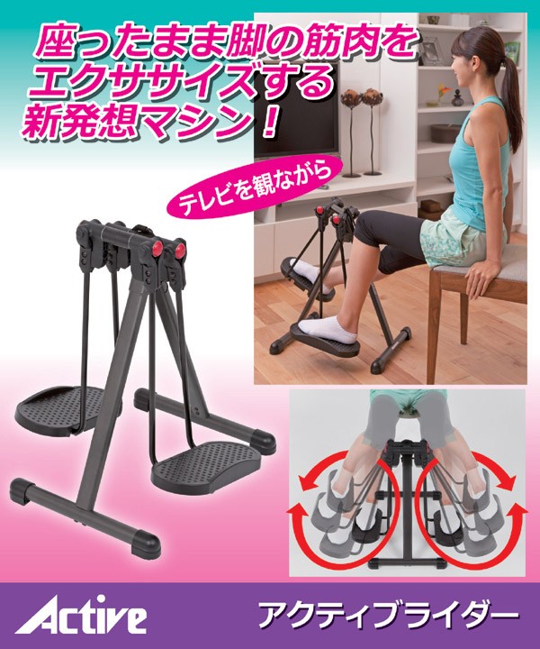 【商品名】 折りたたみフィットネスマシン/アクティブライダー(アシスト運動器具) スチール製 【ジャンル・特徴】 椅子に座ったままエアウォーク!リハビリ/エクササイズ/健康器 脚の筋肉の衰えは身体の衰え、と言われるほど大事な部分です。歩いたり走ったりと運動方法はありますが、「疲れる」「汗をかく」などがイヤだ・・・というアナタでも始めることができる新発想の運動マシンです。イスに座り、マシンに脚だけを乗せて前後左右へと自由に脚を動かしてください。動き方によって太もも、ふくらはぎの筋肉を動かせます。歩行や走行とは違い、脚にかかる負担が極端に少ないため、脚に自信が無い方でもご使用いただけます。■商品スペック【商品名】アクティブライダー 【販売元】株式会社後藤 【生産国】台湾 【セット内容】 【カラー】 【素材】本体:スチール(エポキシ樹脂塗装)ステップ:ポリプロピレン脚用キャップ:PVC 【使用方法】 【サイズ】使用時:幅47.5×奥行47.5×高さ57.5cm折畳時:幅47.5×奥行14×67cmステップ:幅13×奥行28.5cm 【重量】約5kg 【特記事項】 【注意事項】
