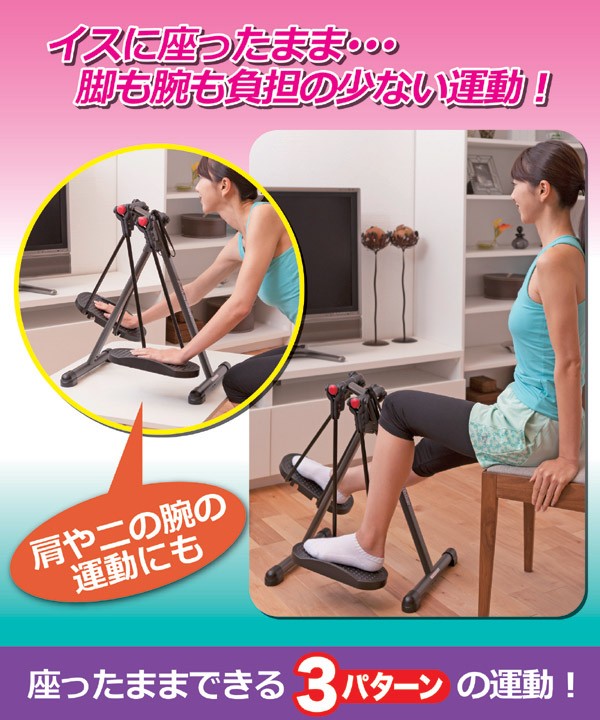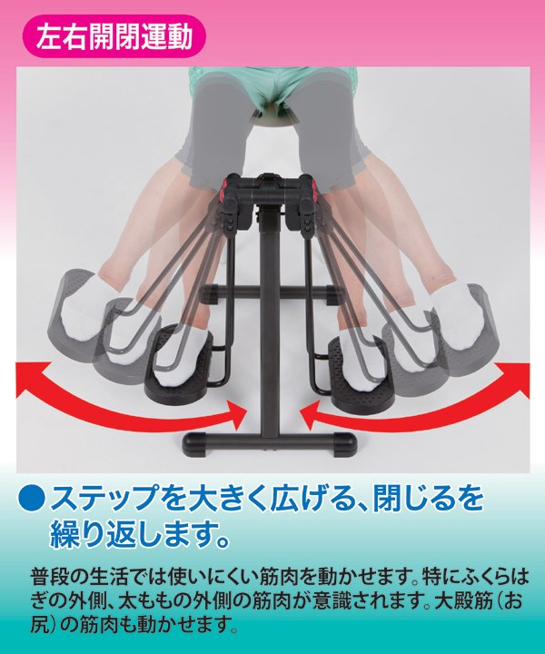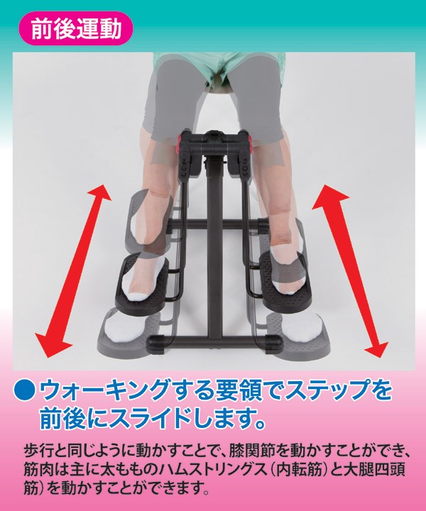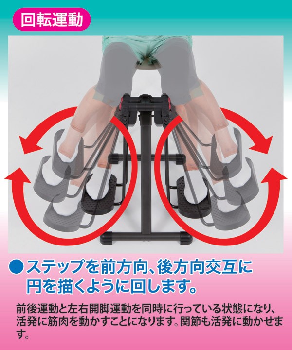 脚の筋肉の衰えは身体の衰え、と言われるほど大事な部分です。歩いたり走ったりと運動方法はありますが、「疲れる」「汗をかく」などがイヤだ・・・というアナタでも始めることができる新発想の運動マシンです。イスに座り、マシンに脚だけを乗せて前後左右へと自由に脚を動かしてください。動き方によって太もも、ふくらはぎの筋肉を動かせます。歩行や走行とは違い、脚にかかる負担が極端に少ないため、脚に自信が無い方でもご使用いただけます。