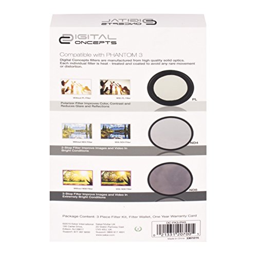 The 3 Piece Filter Kit is designed specifically for the Phantom 3 Advanced and Professional cameras. Complete with the essentials, this kit includes Circular Polarizing (CPL), and two Neutral Density (ND4 & ND8) filters made of high-quality optics to improve HD video and image capture from the skies. The CPL filter eliminates unwanted reflections from bodies of water, glass reflections and more. Additionally, it intensifies color saturation for added detail, eliminating the need for editing in post.