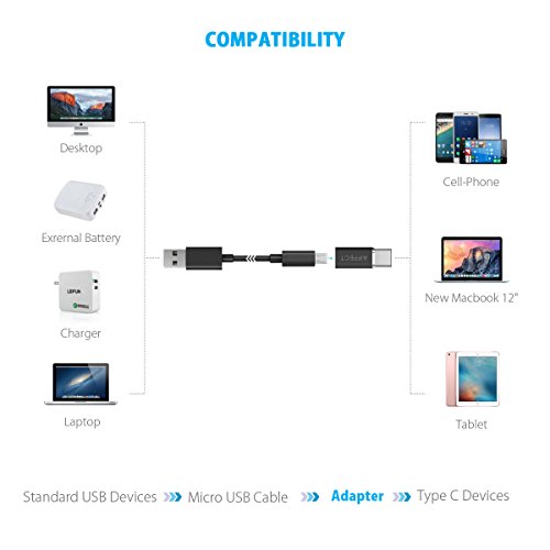 -. Feature : Designed and constructed with high quality aluminum shell for ultimate in reliability and durability / Perfect for QC3.0 and QC2.0 fast charging technology (Needs QC Supported Device and Charger) and supports max output 3A / Simply plug a standard Micro USB cable into the female connector of this adapter, then plug the male connector of the adapter into your Type-C device port / Compatible with MacBook 12", Chromebook Pixel, Nexus 6P, Nexus 5X, Lumia950, Lumia950X, Nokia N1 and other smart devices with type C port / Light and portable design saves space and easy carrying