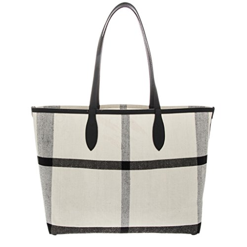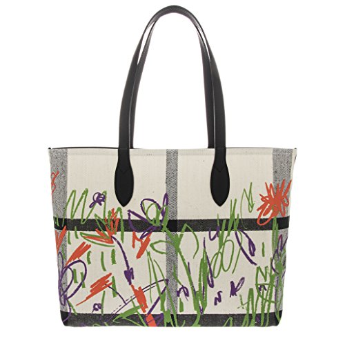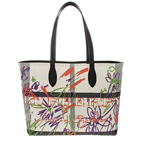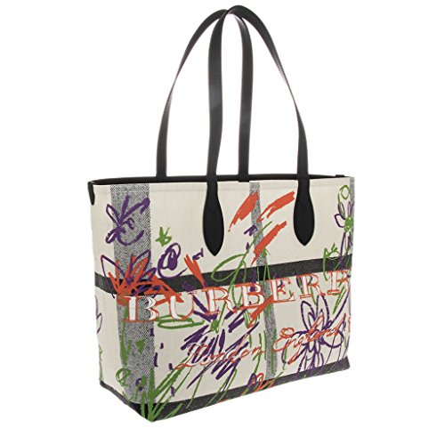 Product Description Burberry Women's Doodletote Check Reversible Canvas Tote White: Colorful, sketchbook-inspired doodles add whimsical charm over the check-printed background of a roomy over-the-shoulder tote that reverses to a doodle-free variation for two looks in one. Open top. Over-the-shoulder handles. Canvas with leather trim. Made in Italy. Approximately: 14a€ H x 12.5a€ W x 7a€ D. 0