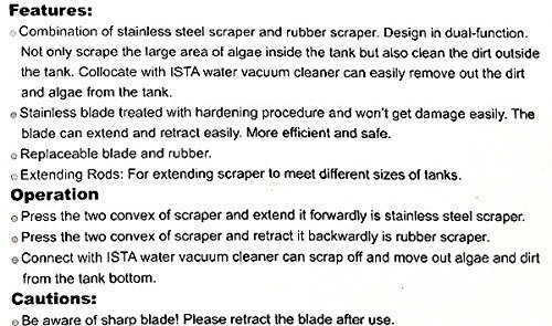 Operation:press the two convex of scraper and extend it forwardly is stainless steel scraper.Press the two convex of scraper and retract it backwardly is rubber scraper.Connect with ISTA water vacuum cleaner can scrap off and move out algae and dirt from the tank bottom.