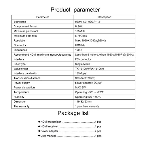 Through the optical fiber transmission HDMI video and audio signal for long distances, up to 20 km; Support video resolution max up to 1920*1080p@60Hz; HDMI 1.3 compatible Support bidirectional RS232 data transmission; Special format is used to compress and decompress video, effectively improve the Transfer efficiency, to ensure that the playback fluency; Support external remote infrared extension, easy to operate the remote device; Able to automatically identify and configure the various display modes;