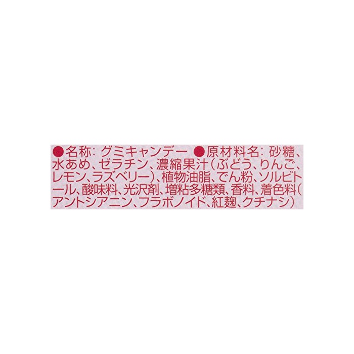 원재료:설탕,물엿,젤라틴,농축 과즙(# 어떻게(아무리),고, 사과,레몬,《라즈베리》)고, 식물성 기름지,나오지 않겠 분,솔《비토루》,신맛료,광택 제,증점다당류,향료,착색료(앤《도시아닌》,후라보노이드,홍누룩,치자나무)