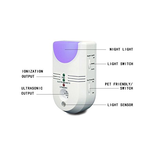 -. Feature : INVISIBLE SHIELD: Using three high-powered technologies, Seicosy Pest Repeller creates an invisible shield to protect your home from rats, mice, spiders, ants, roaches and more. You won't hear a thing as pests are driven from your home by the combined power of ultrasonic, electromagnetic and ionic technology. / 5-in-1 Multifunctional: Ultrasonic + Electromagnetic + Anion + Smart Night Light + Pet Friendly Mode; Seicosy Pest Repeller is the original indoor ultrasonic pest repeller and the only one with three powerful pest controlling functions. / CHEMICAL-FREE PEST CONTROL: Safe and maintenance free. Plug the Home Control into the wall and enjoy non-toxic, humane and harmless pest control. The LED lights will let you know that the Machine is working while you enjoy a quiet and pest-free home. / TWO BONUS FEATURES: Seicosy Pest Repeller features a NIGHT LIGHT that you can turn off or set to turn on automatically when the lights go out. It also has a PET FRIENDLY setting, which enables you to use the device without disturbing your pets. / Best After-sales Service: It will take 2-4 weeks to notice results, 100% Effective to solve your pests problems, 30 day money back guarantee, reply customer's inquiry in 24 hours. - Any questions about the product, welcome to consult us.