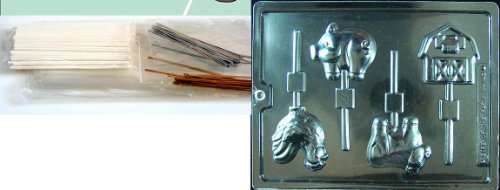 Cybrtrayd 45StK50-K143 Farm Animal Lollys Kids Chocolate Mold with Lollipop Supply Bundle, Includes 50 Lollipop Sticks, 50 Cello Bags, 25 Gold and 25 Silver Twist Ties with Instructions