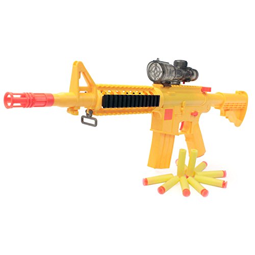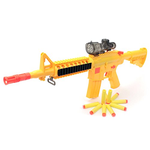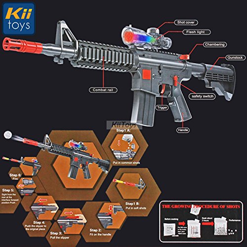 -. Feature : LOTS OF FUN - Toy foam blaster gun M4 r.i.f.l.e constructed from plastic for kids and comes with a target practice! 2 in 1, shoots foam darts and environment friendly water ammo, soft and safe, Easy to use spring loaded pump action system no batteries needed! / EASY TO USE - Foam blaster is operated without any batteries! Just insert foam dart and cock and shoot! Tons of fun for the kids and perfect for outdoors! / COOL STYLE - Comes colored in ock scope attached at the top! Insert foam darts through the front or load up a couple water pellets through the top mock scope! / LOADS OF AMMO - Included in the package is 9 foam darts, and a jar of spongy water shots! Also includes additional packs of grow it yourself water pellets! Simply leave in water for a couple of hours! / FUN AND SAFE - Water Polymer is soft and safe. Great for kids shooting in the backyard especially with the targets that are included in the package!