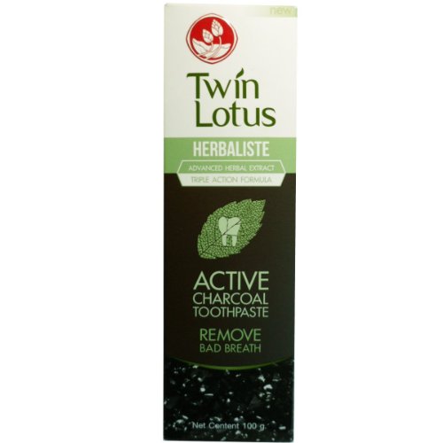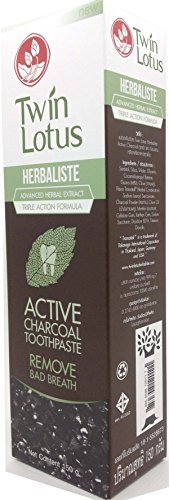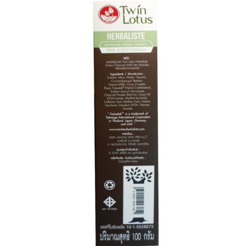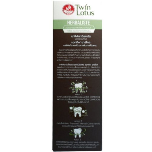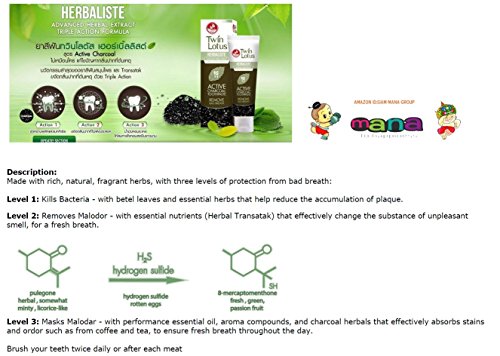 -. Feature : P.R.IME&Fast Shipment by AMAZON Service.Twin Lotus Active Charcoal Toothpaste Herbaliste Triple Action MADE In THAILAND and Sold By SIAM-MANA-GROUP Help relieving sensitive teeth and reducing cigarette, tea and coffee / Size : 50 Grams, 100 Grams, 150 Grams / Level 1: Kills Bacteria - with betel leaves and essential herbs that help reduce the accumulation of plaque. / Level 2: Removes Malodor - with essential nutrients (Herbal Transatak) that effectively change the substance of unpleasant smell, for a fresh breath. / Level 3: Masks Malodar - with performance essential oil, aroma compounds, and charcoal herbals that effectively absorbs stains and ordor such as from coffee and tea, to ensure fresh breath throughout the day.