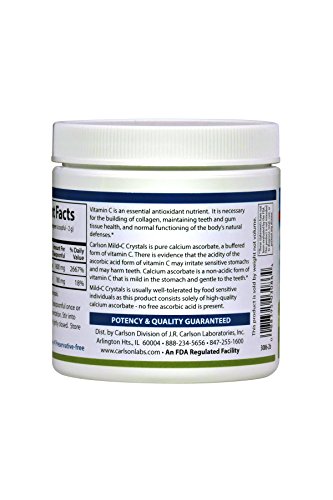 Vitamin C is an essential antioxidant that supports healthy immune system function, teeth and gum tissue health, and the body's natural defense system. Carlson Mild C Crystals are made from pure calcium ascorbate, a combination of calcium and vitamin C, making it mild on the teeth and gentle in the stomach. Each 1/2 teaspoon contains 1,600 mg of vitamin C. Mild C Crystals offer a light lemon taste and can be placed in water or a flavored drink.Feature
