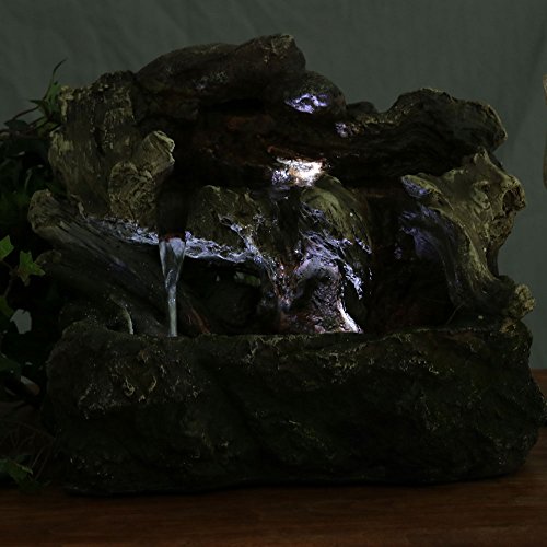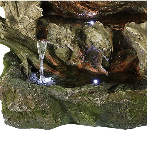 - Nature-inspired indoor electric tabletop tree trunk water fountain featureThis durable resin fountain is carved to look like real stone and an old fallen log. The soothing sounds it creates will have you relaxing in no time! The fountain features padded feet and natural coloring. The electric pump enables the gently flowing water to flow from the top tier all the way down to the bottom pool where it then recirculates back through the fountain. The fountain also includes LED lights that help to illuminate the fountain and makes the water glimmer and elegantly reflect off of surrounding surfaces.