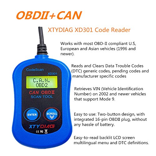 -. Feature : Supports wide range of vehicles: For most OBD-II compliant USA, European and Asian vehicles (OBD-II is standard on all cars sold in USA after 1996). / Powerful functions: Read and clear fault codes, turn off the check engine light. Support multiple trouble code requests: generic codes, pending codes and manufacturer of custom code. / Supports the CAN (Controller Area Network) protols and all other current OBD-II protocols.Retrieves VIN (Vehicle Identification No.) on 2002 and newer vehicles that support 9 Mode. / Easy to use: Two-button design, easy-to-read backlit LCD screen, multilingual menu, DTC definitions with integrated 16 pin OBD2 plug, without hassle of battery. / An useful DIY tool for all car owner, with XTYDIAG XD301 code reader, you are able to check the engine and solve some problem by yourself.