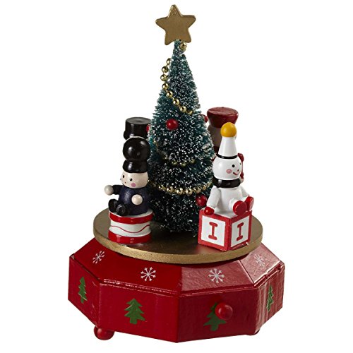 - Made of wood; plays melodic tune from 'Jingle Bells' while toys and tree rotate