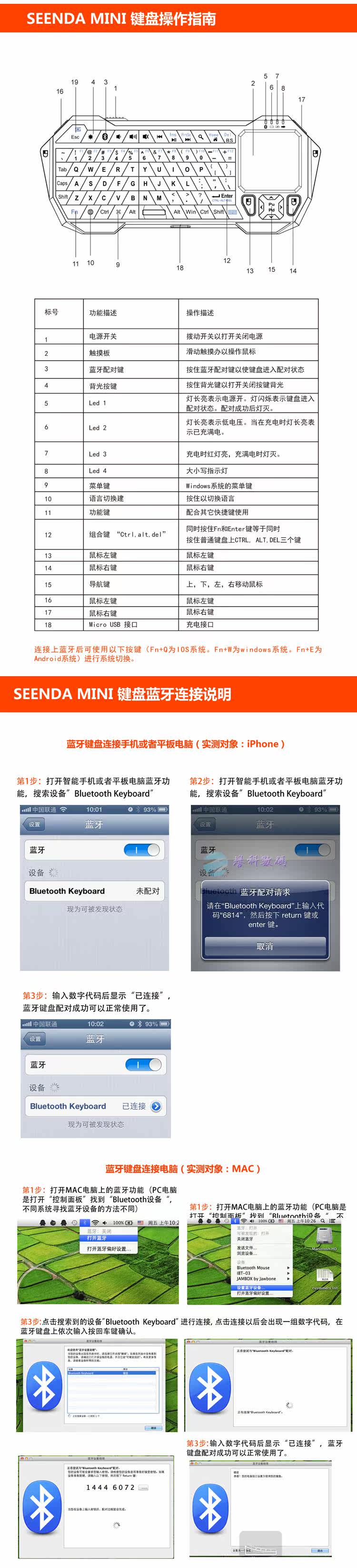 首先要确定您的手机是不是有HID功能(苹果、三星、HTC、联想等手机基本都是有HID功能的),如果您手机的蓝牙只有EDR功能(很多国产手机都是这样的)就只能连接蓝牙耳机,不能使用键盘功能的,也就是手机不能支持蓝牙外接键盘。判断的依据是,当蓝牙配对连接的时候,您的手机会不会提示一串代码让他在蓝牙键盘上输入,如果会就是可以用,如果手机让他输入一个密码,那就是不支持的意思。