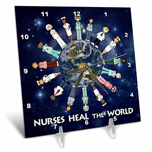 Nurses heal the world planet earth with male and female nurses of all cultures circling the globe desk clock is a wonderful complement to any room in your home or office. Made of durable high grade aluminum. This frameless clock has a high gloss mirror like, UV coated, scratch resistant finish and is suitable for a moist environment. Measures 6" x 6" and requires one aa battery; not included. Battery box is not covered.Feature