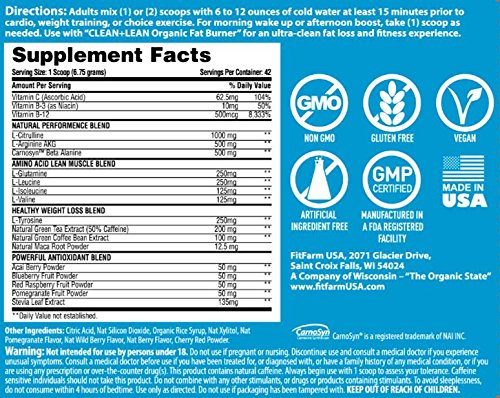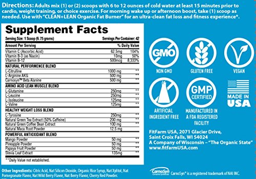 -. Binding : Health and Beauty -. Brand : FIT FARM USA -. IsAdultProduct : 0 -. Label : FIT FARM USA -. Manufacturer : FIT FARM USA -. MPN : CLEAN+LEAN NATURAL PERFORMANCE -. PackageQuantity : 1 -. PartNumber : CLEAN+LEAN NATURAL PERFORMANCE -. ProductGroup : Health and Beauty -. ProductTypeName : HEALTH_PERSONAL_CARE -. Publisher : FIT FARM USA -. Studio : FIT FARM USA -. Title : CLEAN+LEAN NATURAL PERFORMANCE "PLUS" by FitFarm USA: Ultra-Clean Workout Catalyst + Healthy Weight Loss Blend, Lean Muscle BCAA's, and Antioxidants- 100% NON-GMO 42 Svgs, 10oz