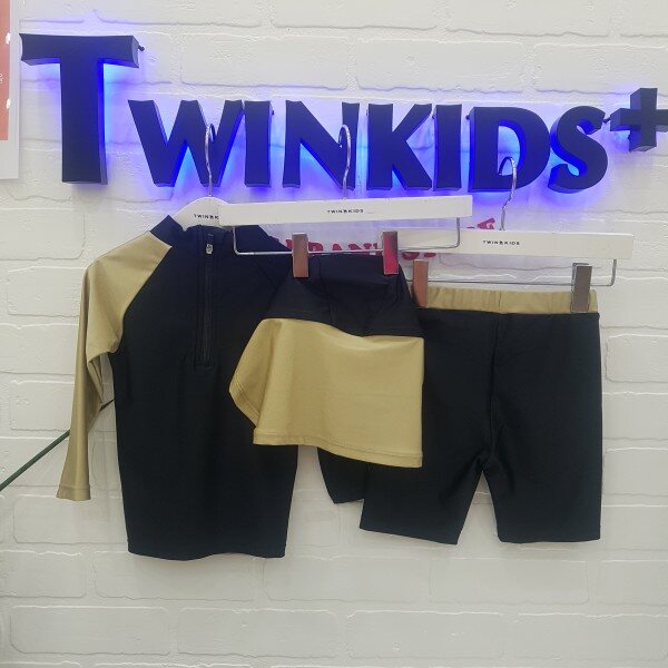 골드 로고 나염이 포인트인 남아 수영복 뒤 지퍼로 착용이 편함