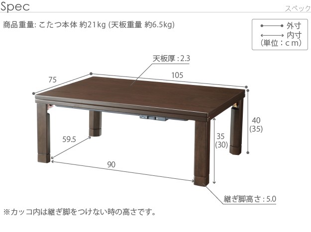 幅105x奥行75x高さ35/40cm(継脚5cm)