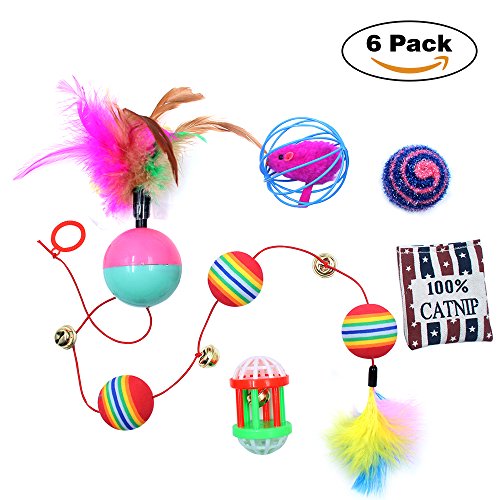 -. Feature : What you see on the picture and what you will get in your order,same model but colors may vary . / Each order contains 6 different models of kitty toys:catnip bag,mouse in the cage,tumbler with feather,teaser lines with 3 balls and 3 bells, glittering ball and a throwing toy. / Your kitty will be supprised on each toy,then crazy on them. / Good choice to keep your kitten busy and excited. / Your cat will be never alone when you are away.