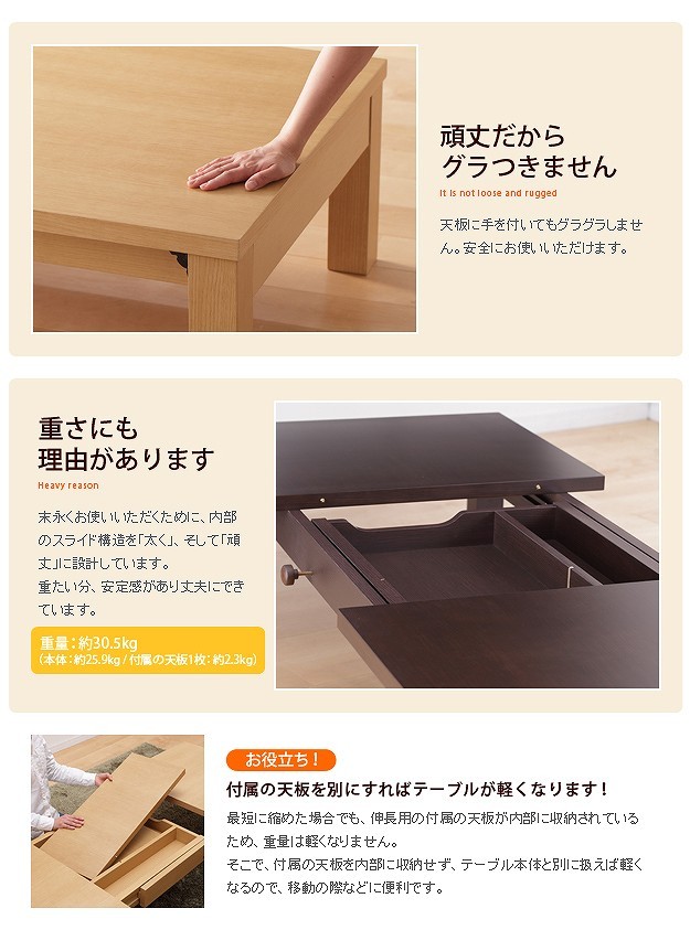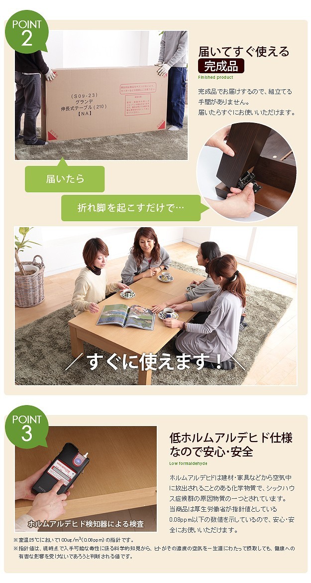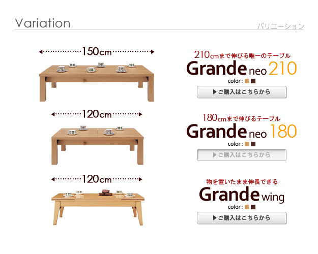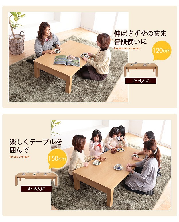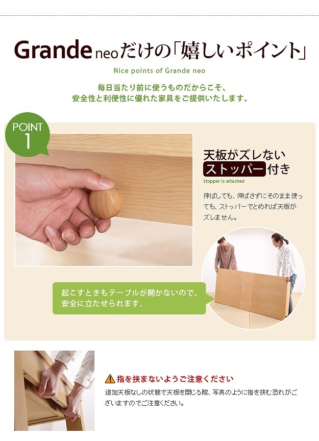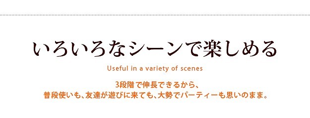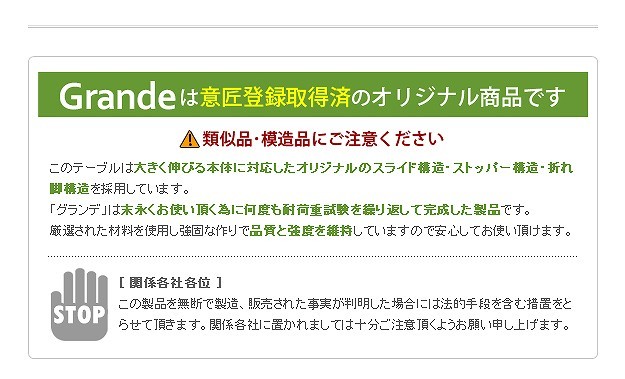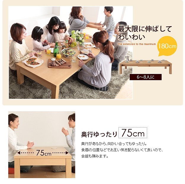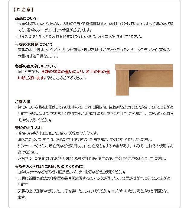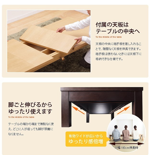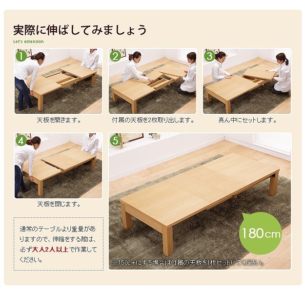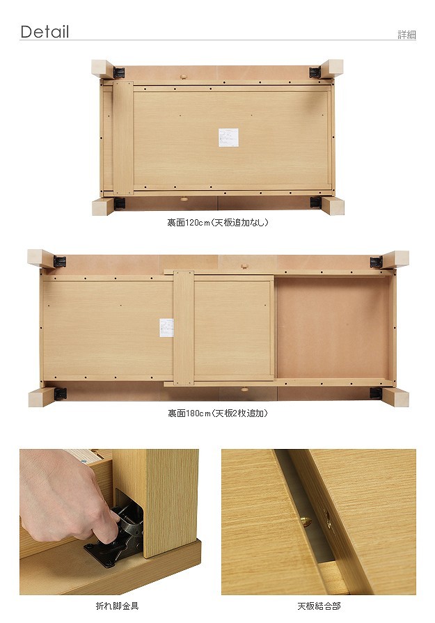 商品について:人数や用途に応じて伸縮できる便利なテーブル♪付属の天板を使って120→150→180cmに3段階のサイズ変更が可能です。安心・安全にお使いいただけるストッパー付き☆付属天板を使わない時は天板下のスペースへ収納できて便利。折れ脚式ですのでスペースをとらずコンパクトに収納できます。