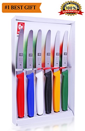 Set of six (6) high carbon stainless steel steak knives, includes one (1) of each from the following colors, Red,Green,Blue,Yellow,Black and White, Beautiful bright classic color steak knives.