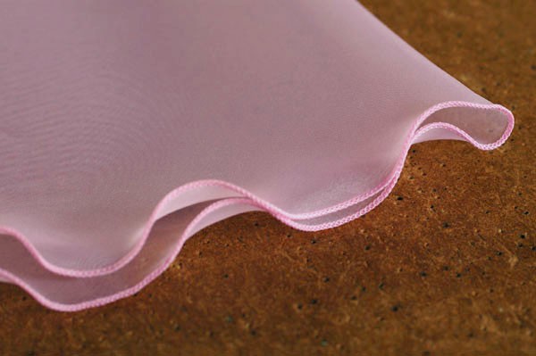 さまざまなバリエーションをお楽しみいただけるリーフデザインです。(えんぴつのように両端がとがっています) シンプルなオーガンジーショールですが、贅沢にバイアスで裁断し、ふちが波打つようにデザインしています。