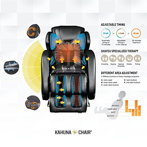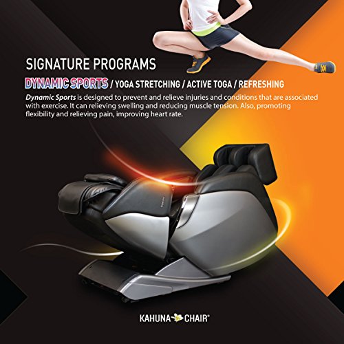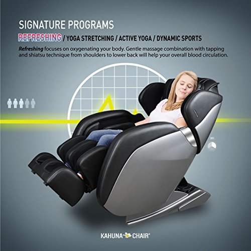 Feature : 2 Types of Stretch programs - Inspired by Original Kahuna Signature yoga stretching and new active refreshing yoga program is also added to the chair. Active refreshing yoga program is dynamic stretch mode to awake your body with full rejuvenating experience. / 3 Interchangeable width of the roller to fit the variety size of people will accommodate up to 6ft 3in, 280 lbs / Kahuna's Special Vibration technique is added to Kahuna Spirit to Boost buttock area blood circulation under the seat with three different levels of intensity. It will give soothing buttock massage for people who sit long time during the day. The Vibration and roller massage function can help genital diseases for men and by heating and including vibration into below waist while massaging the whole body. / Large heating area coverage - on back, legs and on both arms to promote better body circulation and warmth for the body. / Maximum 30 minute massage session with five minute interval adjustments. 3 zero gravity positions with 3 disparate manually adjustable with 5 intensity levels while enjoying 3 levels of vibration of the massage.