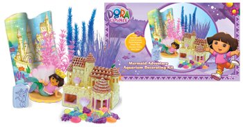 -. Feature : Dora Mermaid Adventure aquarium decorating kit / Come explore the under water world with Dora! Kit comes with miniature Dora mermaid resin, Dora's under-water magic castle back-ground / It also has 3 plastic plants, decorative shells and a glass cleaner