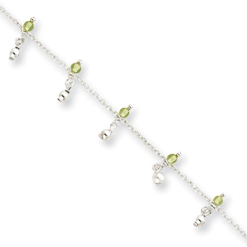 Flirty and feminine, this dangling bracelet will wrap around your ankle with elegant sensuality. It is 9 inches in length and the sterling silver construction promises a long-lasting shine. The 1mm, cable chain secures to your leg with a spring lock clasp and features 3mm genuine peridot and 3mm polished beads. The color range varies on all natural stones so please allow for slight variations in shades. Gemstone treatment: not enhanced.Feature