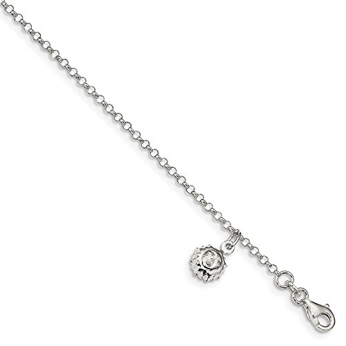 Anklets are a great way to add fun, flash and a feminine touch. This polished dangle design made from sterling silver features a 1.5mm solid link rolo chain with a single 8 (5/16 inch) sun charm. It is adjustable in length from 10 to 11 inches and closes with a fancy lobster clasp.Feature
