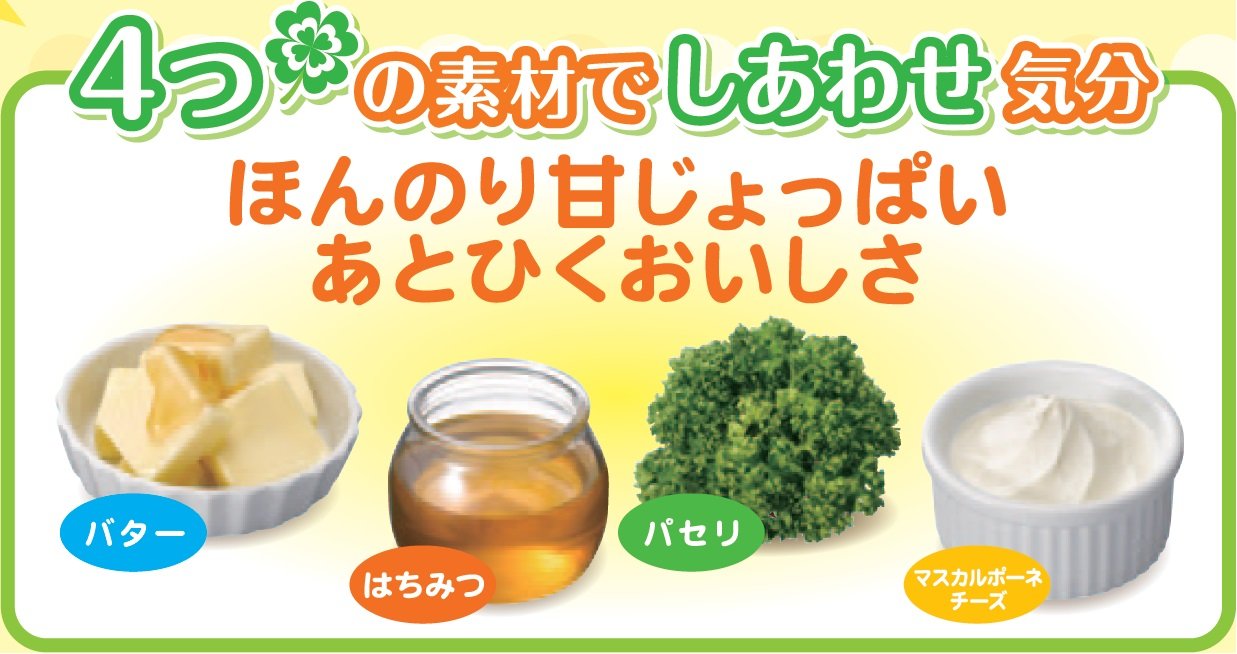 It is 4 (Happiness) butter taste, which combines the four ingredients "Butter" "Honey" "Parsley" "Mascarpone Cheese".