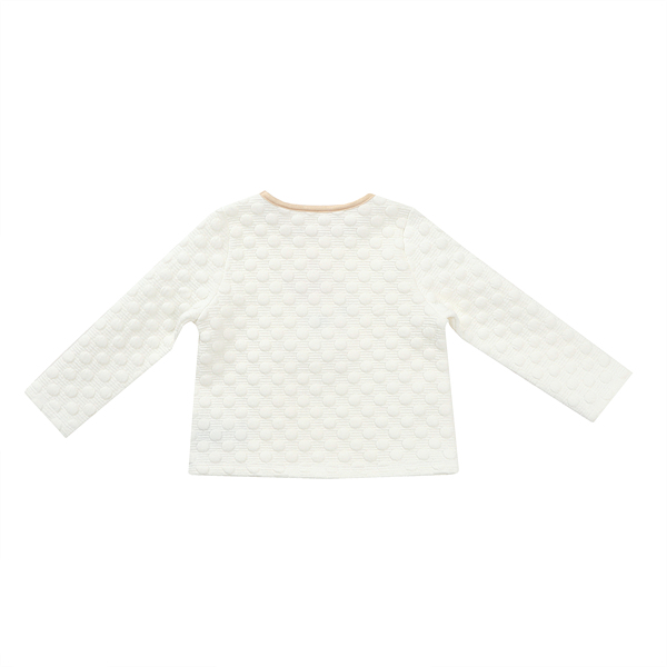 | 상품설명 | 버블 쟈가드 소재로 만들어진 화이트 컬러의 티셔츠 입니다. 입체감 있는 버블 모티브의 쟈가드 다이마루 소재로 만들어 포근하며 편안한 착용감을 줍니다. 네크라인은 고급스러운 느낌의 골드 컬러로 마무리해 주었습니다. 캐주얼한 데님팬츠와 코디하기도 좋고 쟈가드 치랭스와 세트로 코디하기도 좋습니다. |