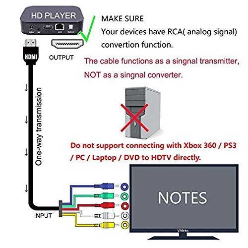 Note: (very important): 1:Does not support connecting with Xbox 360 / PS3 / PC / Laptop to HDTV directly, under these circumstances, you need to use a conversion device in addition. If you do not have a conversion device, please do not buy this item. 2:It does not fit for PS3 and BlueRay player. It need a digital to analog converter before they can work,so you should have a signal converter box to use this cable. 3:This product can only convert the signals from digital to analog, but not analog to digital. And if you want to convert analog to digital, you should buy a conversion device separately. 4: This cable functions as a signal transmitter, but NOT a signal converter. As HDMI carries digital signals while RCA carries analog signals. 5:Please note: HDMI to RCA cable is designed to connect and transfer signals from HDMI port to RCA port.