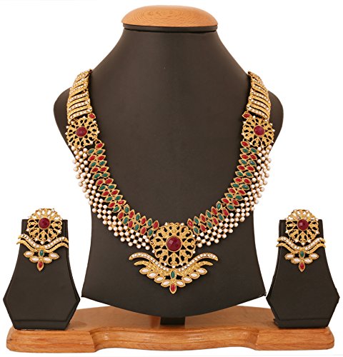 Alloy metal, antique gold tone, stunning, distinct and breath taking bridal haar necklace set, enriched with faux ruby, emeralds and rhinestones. For Perfect Matching, search for TOUCHSTONE BANGLES.
