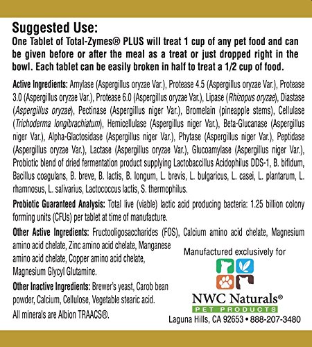 Total-Zymes Plus is formulated with 16 vegetarian enzymes and 14 species of Pro-Biotics plus Pre-Biotics. Each tablet supplies one billion CFUs of those 14 different species of live Pro-Biotics. Total-Zymes Plus is a full strength combination of digestive enzymes as well as systemic enzymes with Pro-Biotics and Pre-Biotics in a tasty chewable tablet. Total-Zymes Plus will help combat digestive problems, while enhancing a beneficial bacterial balance. Total-Zymes Plus is recommended for related issues such as loose stool, skin and coat, sensitive stomach, hairballs, low energy, and even bad breath. Total-Zymes Plus will help you achieve for your pet Total Digestive Health by improving digestion and absorption of your pet's diet, no matter what you feed them.Feature