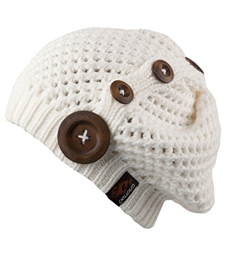 -. Brand : Chillouts Headwear -. Department : womens -. Feature : Braided slouchy hat that will keep you warm in any weather / Soft and stretchy - provides a snug comfy fit! / Four wooden buttons on the side / Made to last out of 100% soft acrylic / One size fits most -. Model : 3554-$P -. ProductGroup : Apparel -. ProductTypeName : APPAREL -. Title : Chillouts NELLY Soft Thick Cable Knit Slouchy Stretch Beanie