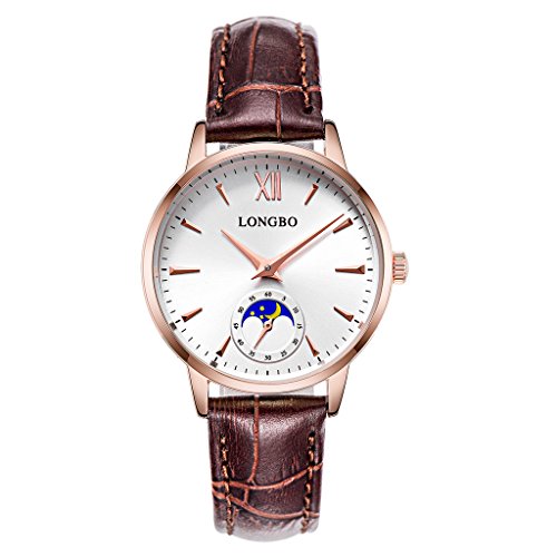 -. Binding : Watch -. Brand : LONGBO -. Department : womens -. Feature : Precise Time Keeping / Suitable For Wear In Business(This is Women Watch) / Elegance Style With Genuine Leather Strap/Charming Design Roman Dial / Original Quartz Movement Business Casual Combine,Sun And Moon For Decorative / This is a perfect casual and simply watch for you. Also make it a great gift for family or friends or lover -. Label : LONGBO -. Manufacturer : LONGBO -. MPN : 5008L-RG0105 -. PackageQuantity : 1 -. PartNumber : 5008L-RG0105 -. ProductGroup : Watch -. ProductTypeName : WATCH -. Publisher : LONGBO -. Studio : LONGBO -. Title : LONGBO Casual Women's Rose Gold Plated Sun Moon Phase Roman Numeral Business Watch Brown Leather Band Dress Wristwatch Waterproof Date Watches